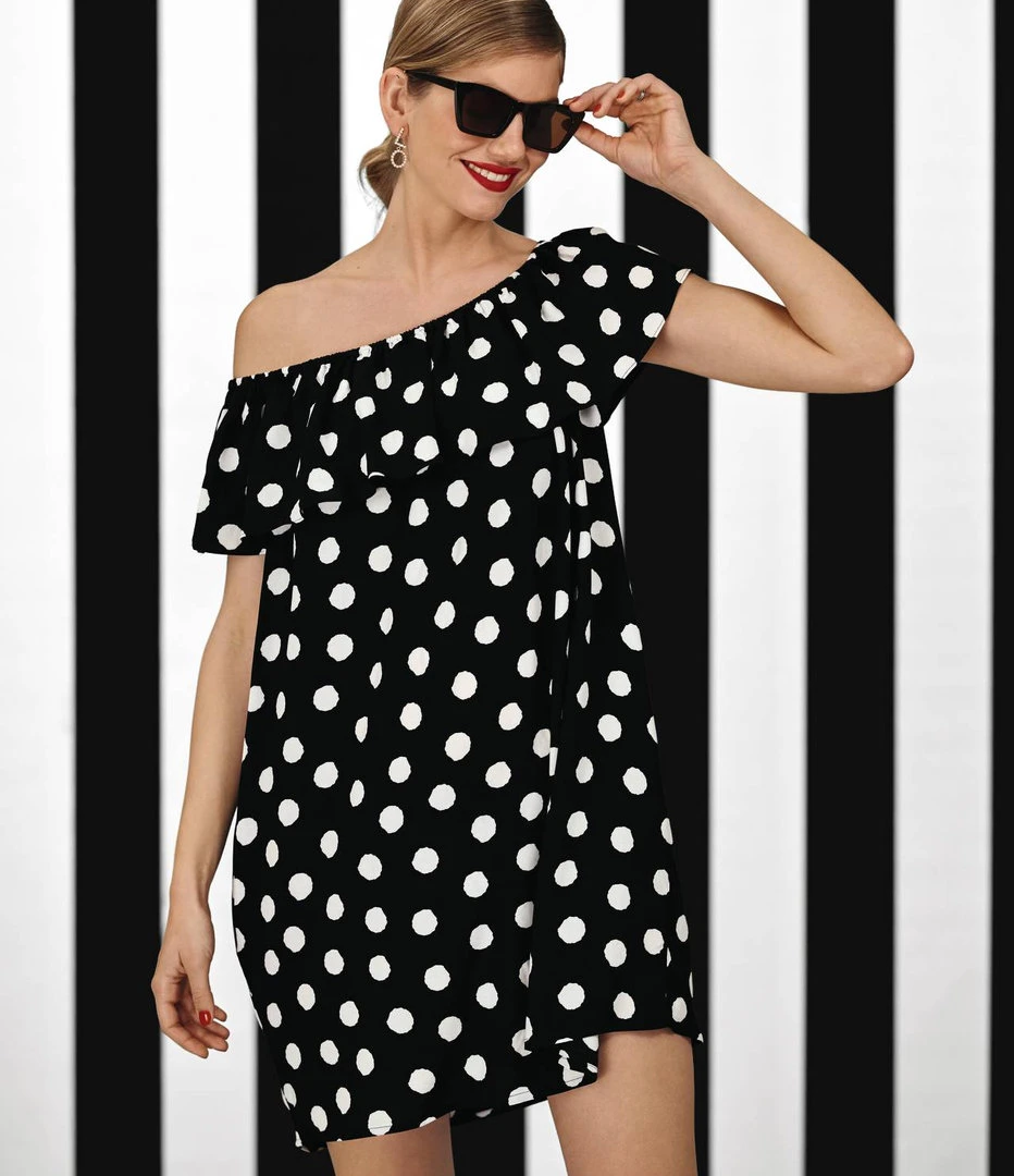 Das kurze Kleidchen Brava aus der Summer Dot Kollektion ist im schulterfreien Look mit Volant geschnitten.