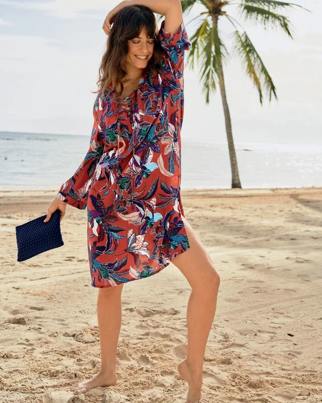 Die langen Ärmel dieser luftigen und farbenprächtigen Tunika schützen ideal vor der Sonne.