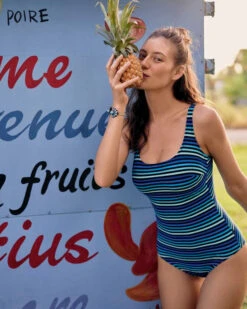 Pure Sommerlaune versprüht der Badeanzug Marle der Serie „Java Love“. Die leuchtend bunten Streifen in Blau- und Türkistönen machen so richtig Lust auf Meer! Der Einteiler für Strand und Pool überzeugt mit eingearbeiteten Innenbügeln und verstellbaren Trägern, die für optimalen Halt sorgen.