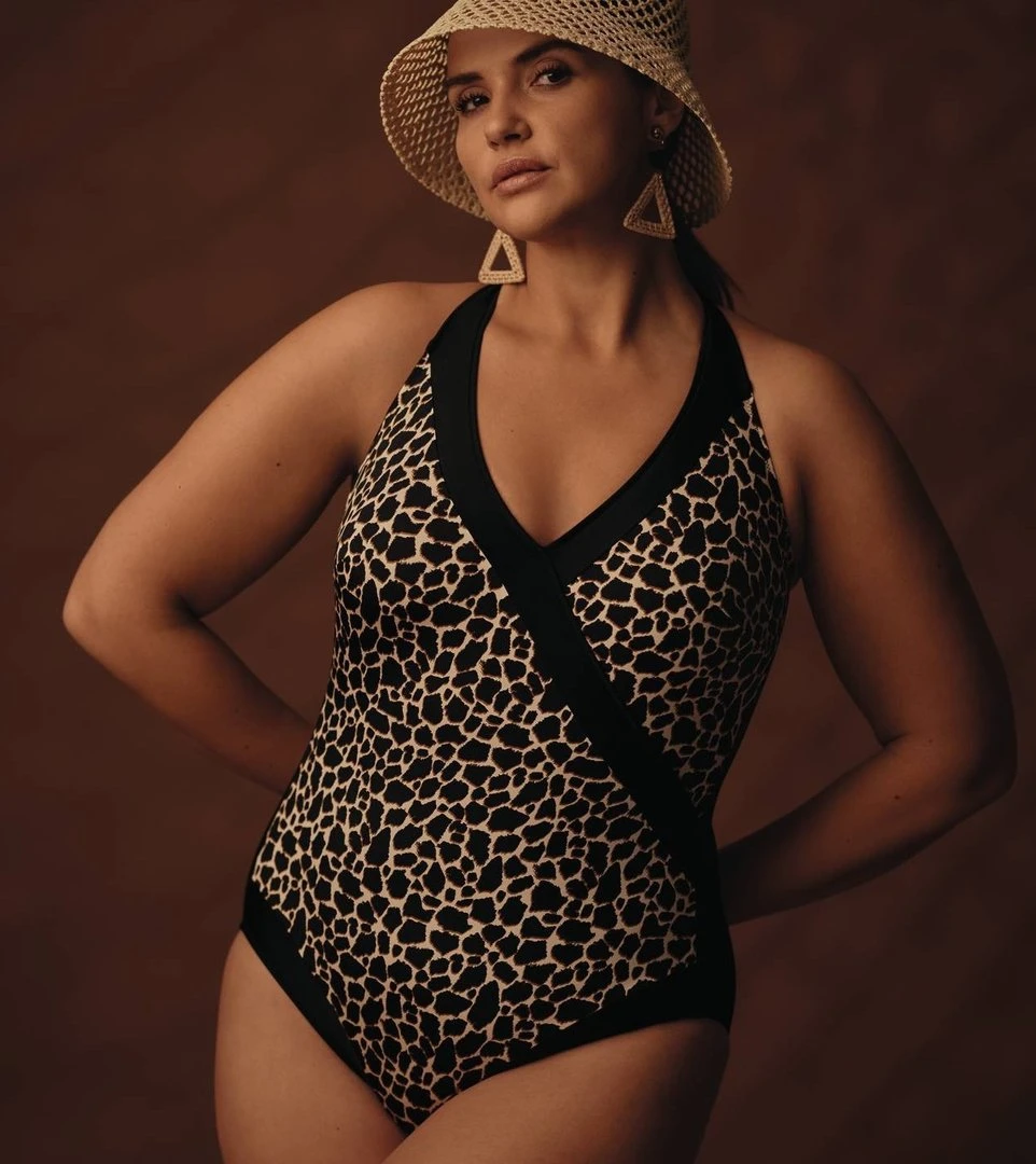 Dieser raffiniert geschnittene Badeanzug aus der Trendy Giraffe Kollektion kann als Neckholder oder mit Trägern getragen werden.