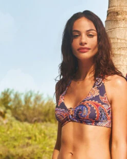 Das Indian Summer Neckholder Top B-Cup wird im Rücken und Nacken geknotet. Dieser mysteriöse Druck erinnert Sie an endlose Sommer! Ein Paisleydruck in schönen warmen Farben auf einer dunklen Grundfarbe, mit schönen Details veredelt. Passend dazu die Hosen aus der Indian Summer Kollektion.