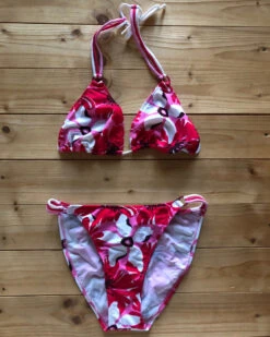 Triangel-Bikini Sumatra in leuchtenden Farben mit floralem Muster und dreifarbigen Schnüren.