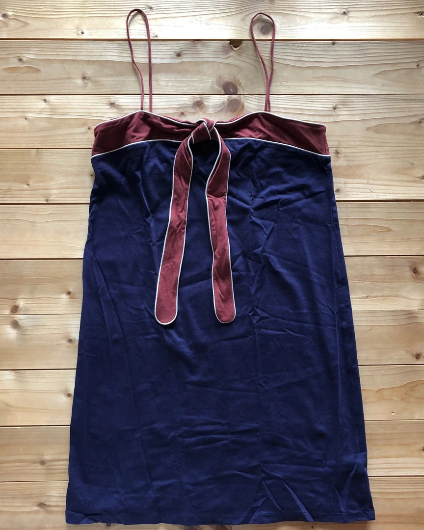 Minikleid aus dreifarbigem Baumwolljersey, sehr angenehm zu tragen. Die rostrote Schleife setzt den Farbtupfer auf dem Weg zum Strand…