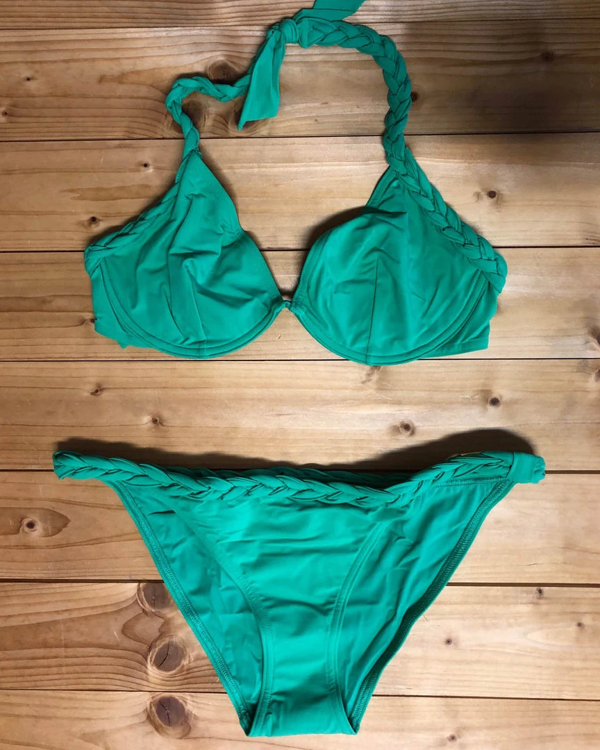Dieser schlichte grüne Bikini verzaubert mit den geflochtenen Trägern an Top und Hose.