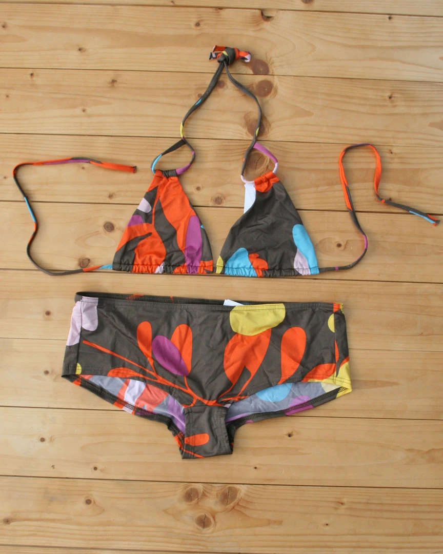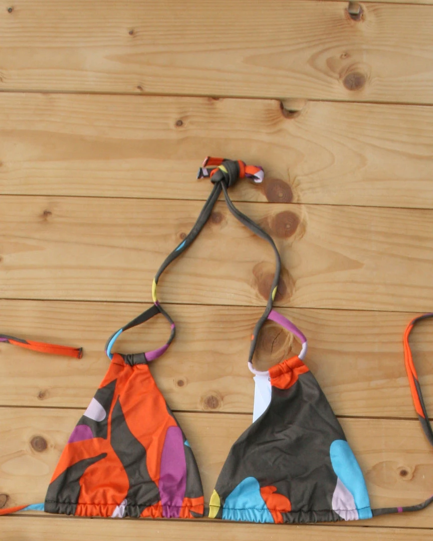 Grafischer Triangel Bikini in aktuellen Trendfarben. Das Bikini Oberteil ist flexibel im Nacken und im Umfang zu binden. Eine schicke sportliche Short rundet den Look ab.