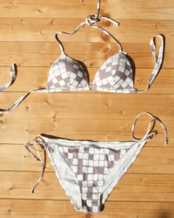 Gemoldeter Mikrofaser Triangel Bikini in Karo-Optik aus feinem Stretch Jersey. Die entnehmbaren Push-up Kissen mit abgestufter Polsterung lassen das Dekollete optisch größer wirken. Im Nacken sowie im Umfang flexibel zu binden. Der Bikinislip ist seitlich zu binden und hüftig geschnitten.