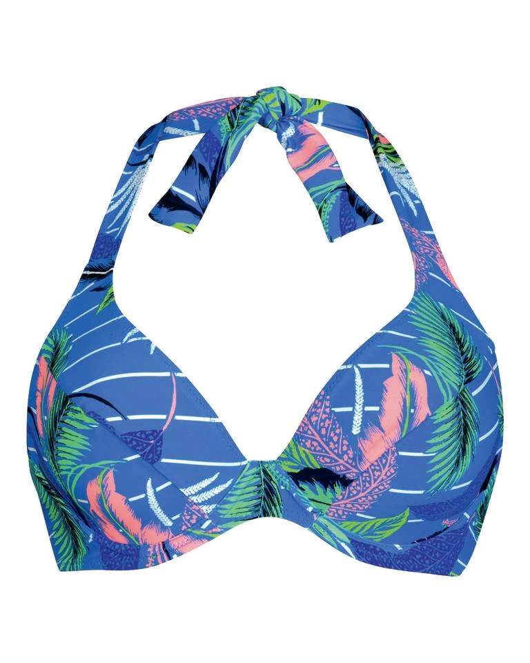 Traumhafte Strandtage verspricht das Bikini Top Amira aus der „Laguna“ Linie! Der tief-dekolletierte Neckholder-Bügel-Bikini setzt das Dekolleté verführerisch in Szene. Voll gefütterte Cups und elastische Verstärkung im Neckholderband sorgen für idealen Komfort und Bequemlichkeit. Mit dem fröhlichen Tropen-Muster setzten sie am Meer gekonnt Akzente. Nur Oberteil, passende Hosen aus dem Mix & Match Programm. Cup C-H, Größe 38-42.