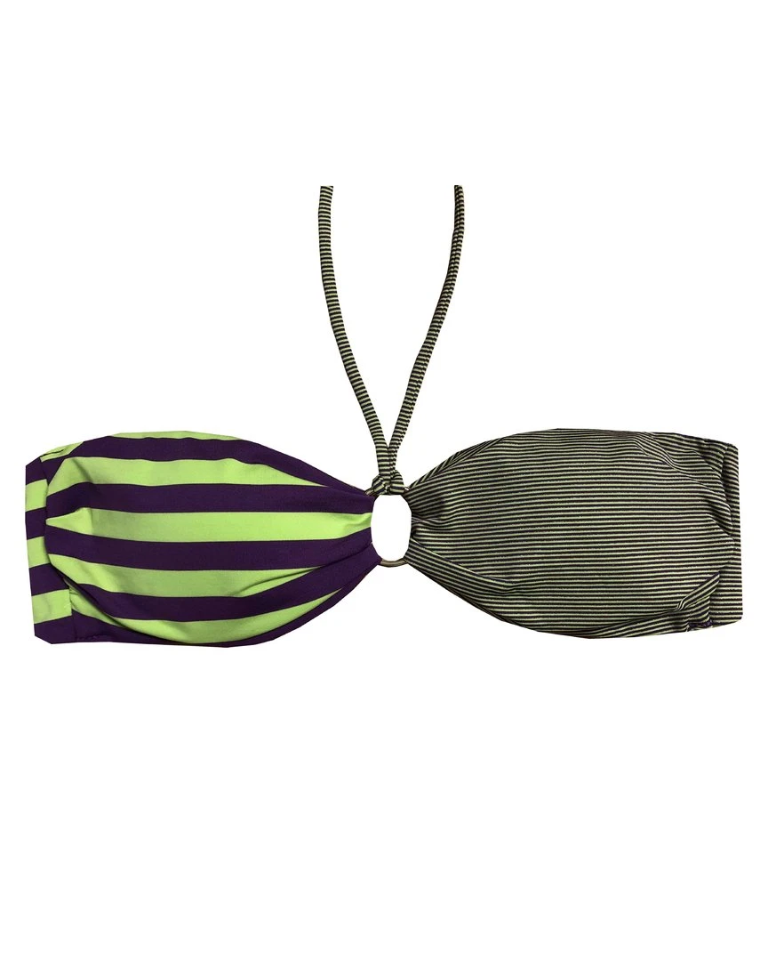 Frech und sexy mit Streifen: Einmal Blockstreifen, einmal feine Streifen zieren dieses grün-lila Bikini-Top im jungen Triangel-Schnitt. Leicht wattiert und unten etwas gerafft sitzen die Cups besonders gut. Blickfang: der goldfarbene Ring in der Mitte. Im passenden knappen Slip zum Knoten wiederholen sich die feinen grün-lila Streifen, er ist gefüttert. Auch mit Bandeau Top erhältlich!