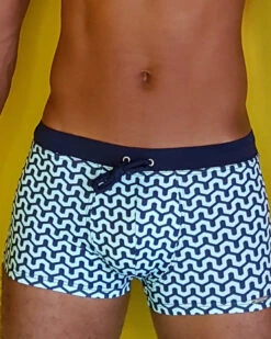 Die hätten sicher auch die griechischen Götter der Antike gerne getragen: Die körperbetonte Pant der deutschen Trendmarke Wasserstoff zeigt ein klassisches Mäandermuster in frischem Türkis und leuchtendem Blau.